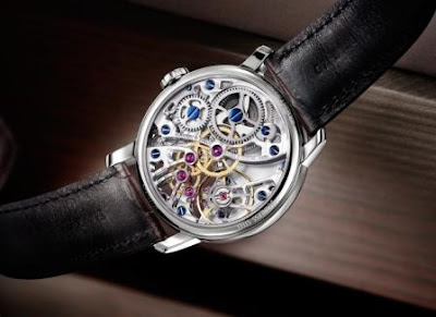Das Classima Executives Skeleton bietet faszinierende Einblicke in die spiralförmigen Stahlbewegungsbrücken durch eine exquisit gestaltete Wahlöffnung zwischen 5 und 7 Uhr. Um 6 Uhr, als ob über dieser Öffnung aufgehängt, verfügt das Sekunden-Subdial über den gleichen subtilen gebläuten Stahlschirm wie die Hände. Die skelettierten Formen des Kalibers können durch einen Saphirglas-Gehäuseboden genauer bewundert werden, der einen Mechanismus zeigt, der mit 17 Rubinen, fein gearbeiteten Rädern, schrägen Brücken, ausgeschnittenen Platten und gebläuten Schrauben geschmückt ist.